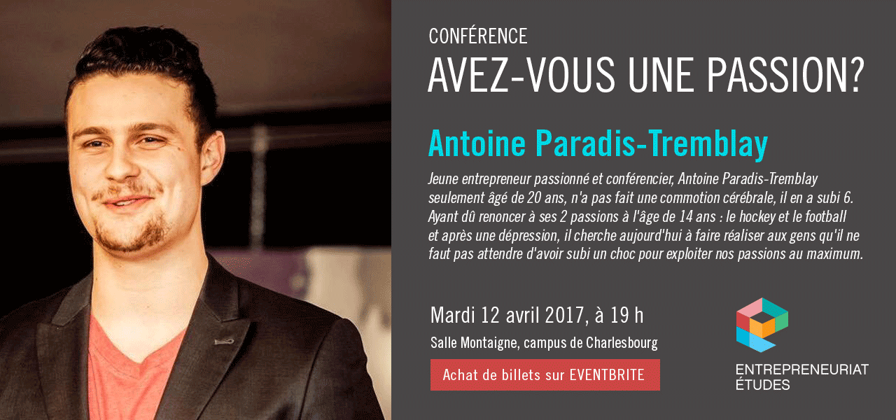 Dans le cadre de la programmation d’hiver 2017 d’Entrepreneuriat-études, nous vous invitons à assister à la conférence « Avez-vous une passion? » d’Antoine Paradis-Tremblay, le mercredi 12 avril 2017, à 19 h, à la salle Montaigne du campus de Charlesbourg.